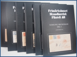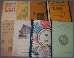 stämplar år 1819-1982 av Åke Persson, Västerbottens Läns makuleringsstämplar 1819-1986 av Erik Idhult, Handbok över Kristianstads Läns Makuleringsstämplar av Handbok över Malmöhus Läns makuleringsstämplar av Nils Ivar Johansson, Posthistoria från Jönköpings Län av Lennart Berg, Posthistoria, Ortsstämplar, Frimärken Gästrikland 1636-1999 av Gunnar Åberg, Hälsingland Postanstalter och Nils Ivar Johansson, Katalog över Y-Läns ortsstämplar av Christian Forsberg, Jämtlands Läns Postala Datumstämplar 1819-1988 av Östersunds FF. Alla i varierande kvalitet med limmade ryggar eller kopierade inlagor med ringbindning. (3,6 kg)