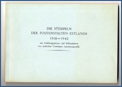 mit Eröffnungsdatum und Schlussdatum von amtlichen Unterlagen zusammengestellt. (The Postmarks of the Postal services of Estonia 1918-1940 with opening and closing dates, compiled by official documents). av Georg B. Lindberg. Limmad rygg, Liggande A4, 67 sidor. Enligt uppgift en upplaga av endast 100 exemplar. Fräscht exemplar.