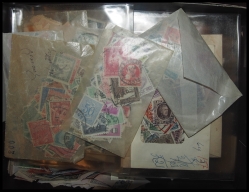 hela världen varav stor del Sverige, Danmark och Europa. Massor av buntar, frimärken i lådor och pergamynkuvert, lite försändelser och ca 30 % klipp. Fyndchanser. Lågt utrop.