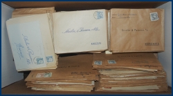 skolåda med mest äldre FDC, flera bättre. Även 1 album stämplat samt blandad låda mest lösa märken + bunt äldre brev och vykort.