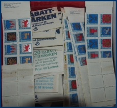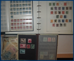 i 4 album + mängder av lösa blad samt 2 glasslådor med dubbletter, i den ena ligger bla 40 st (*) fuktskadade kompletta rabatthäften där säkert många märken kan räddas för frankering.