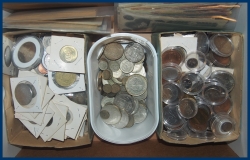 från Hela världen. Mest 1900-talet med mycket från Sverige bla silvermynt: 5 kr (4 st), 2 kr -42 (2 st), 2 kr -66 (20 st), 1 kr -42 (3 st), 1 kr -68 (26 st), 50 öre (2 st), 25 öre (10 st), 10 öre (19 st). Även sedlar från Sverige med 1 st 100 kr och 19 st 10 kr samt 50 st 5 kr varav 20 ovikta sedlar 1952 i nummerföljd Y676065-676084 + Plastficka med ca 100 blandade sedlar ca 1930-2000 talet, från övriga världen.