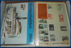 En samling 1858-1969 i Leuchtturmalbum, i början mest stämplat som sedan övergår till mest **. En samling** 1986-95 ser komplett ut. Tillkommer 4 årssatser 1996-99. FDC samling i 3 album 1984-2000. Ett USA album ganska glest. Finns lite mer Sverige i pärm och insticksalbum någon snygg stämpel här och där. Nominal drygt 4.500 SEK. Lågt utrop!