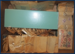 Hela världen, även Sverige. Ser ut att vara orörd sedan minst 40 år sedan, massor av pergamynpåsar med frimärken i 4 lådor (en Sverige) även askar, smålådor, kuvert bl.a med Sverige **, buntar, klipp mm. En rolig låda att leta i.