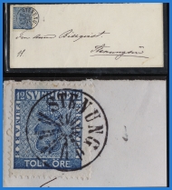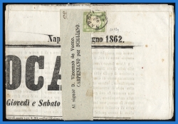 med 1/2 Tornese grön med breda marginaler. Märket binder banderollen till tidningen "L Epoca" stämplad "NAPOLI 5 GIU 62 4S". Vackert exemplar av Neapel nr 1 signerad "Colla".