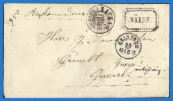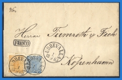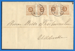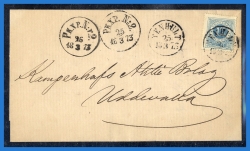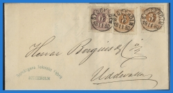 avstämplat "Uddevalla 17.3.1865" och sänt till Köpenhamn med 3x 24 öre Vapentyp (F.10 d1) som frankering. Intyg HOW (1998) Praktobjekt.