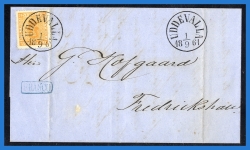 avstämplat "UDDEVALLA 1.9.1861" sänt till Fredrikshall, Norge med 24 öre Vapentyp som singelfrankering.