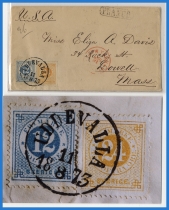 avstämplat "UDDEVALLA 11.8.1873" med "FRANCO." inom ram, transit "PKXP No 2 NED 13.8.1873" samt "NEW YORK AUG 31". Intyg HOW (2014) Mycket Gott-Praktobjekt. Obetydligt hål i 12 öre. Postal 18.000 kr.