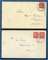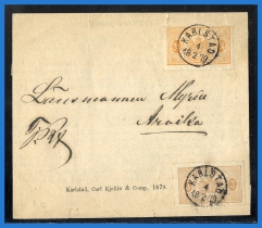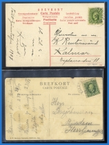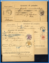 Nyköping 1878 30 öre singel på helt kort med kupong, Gefle 1884 20 öre + 1 krona på helt kort med kupong samt Stockholm Paket C. 1884 6 öre + 24 öre utan kupong.