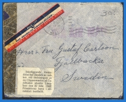 med etikett "...förlisningen av en Clippermaskin på Tajofloden utanför Lissabon den 22 febr. 1943...". Ankomststämplat "STOCKHOLM 16.3.43".