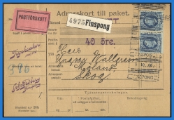 i BLÅ färg, till Björneborg Finland med notering "Via Haparanda" samt "fco grn" (Franco gränsen, dvs betalt till Finska gränsen) med lösennotering "10 kop" kvar att betala.