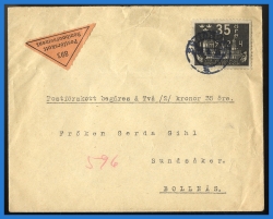 sänt till Sverige. Frankerat med 2 M + 3x 4 M. På baksidan en intressant uträkning (i blyerts) om distans och flygtid mellan alla städer längs rutten. Ankomststämplat "Västerås 10-9-29".
