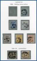 1855-1998 i 4 förtrycksalbum av olika typ (1997-1998 på visirblad). Tre st 4 Sk, varav 2 med intyg (F.2 e med intyg Grenstedt (1981) "ytterst tilltalande exemplar utan någon som helst anmärkning, ett toppmärke" samt SFF no 2 j 2 skiffergruppen gråultramarin med intyg Sjöman (1972) "gott till mycket ex utan defekter, förbättringar eller reparationer"), 6 Sk med intyg Sjöman (1971) "mycket gott exemplar men nedre vänster hörntand saknar en tandspets åt vänster", 8 Sk med intyg Sjöman (1971) "gott till mycket gott exemplar utan defekter, förbättringar eller reparationer", 24 Sk med intyg Frans Obermüller (1978) "Mycket gott exemplar 3, 3, 3 men med tunn fläck och ett svagt veck i nedre vänstra hörnet", svart lokal F. 6 a 3 med intyg Frans Obermüller (1982) "godtagbart exemplar 1, 4, 4-5, övre högra hörntanden bruten (men ej reparerad), vackert och intressant ex med en prakt- till lyxstämpel", brunt lokalmärke med intyg Nils Svensson (1985) "Ett fräscht exemplar med en helt tydlig stämpel och utan defekter, förbättringar eller reparationer 3, 3, 3-4", Vapentyp överkomplett liksom Liggande lejon. F. 14 A b har intyg Frans Obermüller (1981) "gott exemplar 2, 3, 2, nedre högra hörntanden lätt vikt, mycket vackert, rent och fräscht". Ringtyp komplett med flera vackra stämplar, Landstorm I-III komplett, välbesatt bandmärkesavsnitt, Kongress/Förening komplett (dock ej cxz på 10-öringarna), alla BC-/CB-par utom 10 öre Profil höger små siffror (ett fåtal av paren ser lite tveksamma ut), Tjänste, Lösen och Militär komplett. Samlingen innehåller överlag många vackra stämplar och från mitten av 1970-talet är nästan allt välstämplat, inte sällan med Norrköping-stämplar men även andra orter förekommer inemellan.