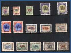 BEFRIET 5 MAJ 1945" komplett serie med samtliga färgvarianter på påtrycken, totalt 15 märken. Facit 30.000 kr.