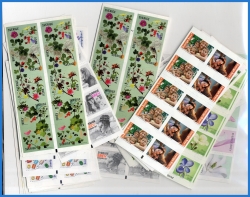 i 3 tjocka insticksalbum med ca 9.000 st märken med flera dubbletter. Många vackra märken.