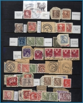 med visirblad inemellan. Börjar med 2x 4 Sk Bco och en fräsch 8 Sk med sidvänd stämpel "STOCKHOLM 19.3.1857", urval Vapentyp och Liggande Lejon med flera läsbara stämplar, likaså Ringtyp och stora Tjänste, Bandmärken med flera vm, Kongressen till 2 kr med luckor, Föreningen till 2 kr, 11 st enklare BC/CB etc.