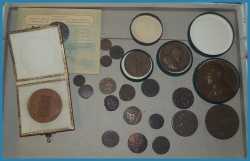 Sverige. 2 brickor med diverse idrottspins och medaljer samt diverse äldre bronsmynt samt 4 vackra medaljer i askar, även minnes"peng" tillverkad av skrovet från Pansarbåten Sverige.