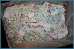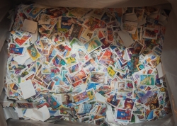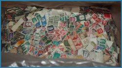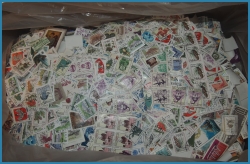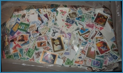 Framför allt handlar det om lösa osorterade märken men det finns även lite buntar och märken sorterade efter utgåva i bruna C6-kuvert. Uppskattad nettovikt för frimärkena 8-9 kg.