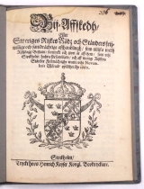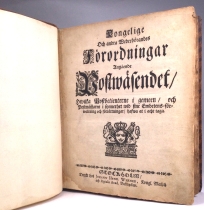 8 sid. Kungörelse i original. Inbunden i nutida läderband, nutida kassett. Mycket gott skick. (Est. SEK 6,000). Proveniens: Skandia-Postiljonen #134 1986 lot 1 SEK 5,400 + 10%.
