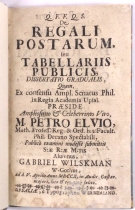 eller den offentliga postbefordringen. Gradualavhandling på latin. Nutida inbindning, medbundet faksimiltryck från Postryttaren (svensk översättning från 1975, förminskad). 36 sid. Mycket gott skick. (Est. SEK 1,500). Proveniens: Skandia-Postiljonen #134 1986 lot 2 SEK 1,600 + 10%.