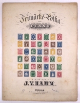 för piano. Ett blad i färgtryck som "avbildar" 42 frimärken från Europa och USA, i nutida hårdbunden kassett (a. baudry). Mycket gott skick. (Est. SEK 20,000). Notera: Utdrag ur Postryttaren 2009 av Björn Sylvan medföljer.