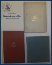 J.A. Thurgren: Stadgar rörande Postwäsendet i Swerige 1858 inbunden, Taxor för postångfartyg 1882, 1884 och 1912, Ernst Grapes Svensk posthistoria m.fl., Olsson/Benzinger: Svenska Postverkets frankotecken Del Ia, III och IV. (Est SEK 1,200).