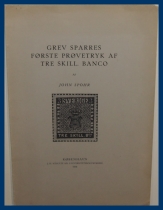 de Suède + Grev Sparres første prøvetryk af Tre Skilling Banco 26+12 sid. Gott skick. (Est. SEK 1,000). Notera: Nummer 11, upplaga 50. Häftade (angiven upplaga avser John Spohr) samt dokumentation om Sparre. Proveniens: Dedikation till Sveriges Filatelist-Förening (avser John Spohr).