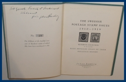 Mycket gott skick, dock slitage på ryggen. (Est. SEK 4,000). Notera: Inbunden lyxupplaga med helark (40 frimärken) av frimärksutgåvan (fem olika valörer) övertryckt Makuleras. Helt guldsnitt, samtida kassett. 368 sid. Nr 20, upplaga 800. Medföljer kort för insamling till Jubileumsfonden (helark). Proveniens: Tillägnad Förste Intendenten Friherre J. Rudbeck; Ex. Frimärkshuset Skandinavisk Filateli AB #139 2014 lot 1065 SEK 4,000 + 22%.