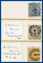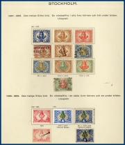 Börjar med 4 Sk, 6 Sk (F.3c) brunaktigt grå med praktstämpel "STOCKHOLM 9.6.1858" och 8 Sk. 3 öre svart lokalmärke med stjärnstämpel, 3 öre brun (*) utan gummering, 9 öre Vapentyp *, 17 öre Liggande lejon både lila och grå nyans * praktcentrerade, Kongressen till 2 kr ** samt stämplat till 1 kr, Föreningen komplett **/* (5 kr **), Gustaf V 70 med "Makuleras" övertryck, 35 st BC/CB ** och O. Det sista albumet mest ** 1960-70 talet.