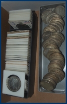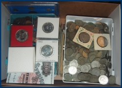 1 kr -1942 (40 st), 1 kr -1968 (44 st), 5 kr (19 st), 50 öre nyare (21 st), 25 öre nyare (23 st) samt 10 öre (75 st). I botten av lådan även ca 6 kg blandade mest svenska mynt samt kuvert med några 5/10 kr sedlar (80 kr).