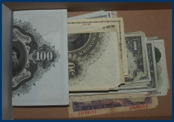 Mest svenska sedlar: 5 kr (65 st), 10 kr (16 st), 50 kr (4 st), 100 kr (3 st) med bla ovikta 5 kr sedlar (1952) i nummerserie R810661-78. Även 28 st utländska sedlar med 16 st USA 1 $.