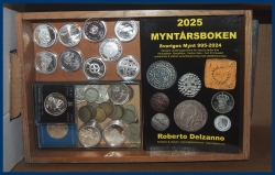 5 kr (1 st), 2 kr -1940 (3 st) 2 kr -1966 (8 st), 1 kr -1968 (18 st), 50 öre (3 st), 25 öre (1 st) och 10 öre (4 st). Även 36 st årsmyntkassetter varav 13 st med giltiga 10 kr:s mynt samt godisburk med mynt och sedlar hela världen. Även Myntboken 2025 med aktuella priser för svenska mynt. Totalt 12 kg.