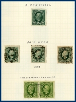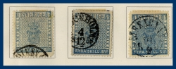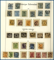 luckor i ett Lindner hingeless-album. Fram t.o.m. 1936 stämplat, från 1938 **/*. 3-skilling, två st 4-Skillingar, varav en med intyg (F.2j2) HOW (2005) "Ett vackert och mycket fräscht exemplar 2,2,2", en 6-skilling, en 8-skilling, 24 Sk. med intyg HOW (2005) "Starkt tvättat. Övre och höger marginal omtandad. Ett mycket färgfriskt märke.", Vapentyp överkomplett, båda lokalmärkena, Liggande lejon överkomplett liksom samtliga Ringtypsserier, Tjänste och Lösen, Landstorm I-III komplett (men F.124 ** i stället för stämplad), välbesatt bandmärkesavsnitt med mängder av olika vm (dock inte de allra svåraste), Kongress/Förening komplett. Från 1938 (**/*) i det närmaste komplett med samtliga BC-/CB-par och även 3-sidiga märken monterade separat. Även t.ex. alla 9-block från Stockholmia 1955. Sammantaget en mycket stark samling i mestadels bra kvalitet. Även en hel del vackra stämplar.