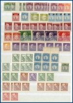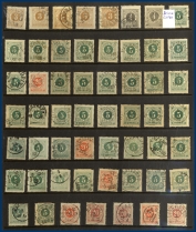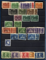stämplat, från 1950-talet och framåt mer och mer **/*. Börjar med ett luckfyllarex av 3 Sk. Bco, 9 st 4-skillingar, ett luckfyllarex av 6 Sk. Bco, 3 st 8-skillingar varav en med intyg Franz Obermüller (1975) "Mycket god kvalitet utan reparationer eller förbättringar" och en med utlåtande Mats G. Nilsson (2025) av vilket det framgår att märket har diverse reparationer, 24 Sk. Bco med utlåtande Strandell (1951) diverse reparationer, 3 st svarta och 3 st bruna lokalmärken i blandad kvalitet, Vapen överkomplett (9-öringen med riss), Liggande lejon komplett, Ringtyp komplett förutom riksdalern t.13, ett par vackra stämplar på Oscar, Landstorm I-III komplett (både F.124 och F.125 *), Kongress/Förening komplett, samtliga BC-/CB-par, Bra Tjänste och Lösen. Från 1940-talet välbesatt med bl a alla 9-blocken i Stockholmia 55. Blandad kvalitet.
