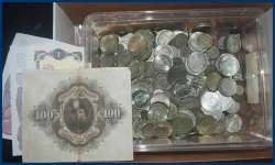 1 kr -1942 (40 st), 1 kr -1968 (44 st), 5 kr (19 st), 50 öre nyare (21 st), 25 öre nyare (23 st) samt 10 öre (75 st). I botten av lådan även ca 6 kg blandade mest svenska mynt samt kuvert med några 5/10 kr sedlar (80 kr).