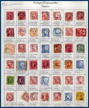 från Ringtyp till 1950-talet. Stämplarna är monterade i två album, i båda fallen från A till Ö. Det ena albumet innehåller stämplar från nedlagda eller namnändrade postkontor, medan det andra albumet innehåller stämplar från postkontor som fortfarande var aktiva vid tidpunkten för monteringen. Mängder med prakt- och lyxstämplar, men totalt sett något blandad märkes- och stämpelkvalitet. Till den här posten hör också en samling Oscarsstämplar (idel 10 öres) på lösblad över Sveriges städer. Många vackra.