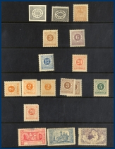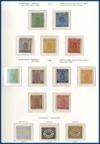 Leuchtturm-album med fickor. Nytryck/Eftertryck av samtliga skillingar och Vapentypsmärken. 3 Sk. F.1 E1 med intyg Harbrecht (1989) "Äkta utan defekter, förbättringar eller reparationer. Mycket gott exemplar 3,3,2". 24 Sk. med intyg Sjöman (1971) "Äkta exemplar av 1:a eftertrycket utan defekter, förbättringar eller reparationer. Mycket gott exemplar 3,3,3". Svart lokal med intyg Sjöman (1969) "1885 års nytryck utan defekter, förbättringar eller reparationer, gott exemplar". Brun lokal med fastsättarrester men i övrigt med gummeringen kvar. Liggande lejon 3 öre typ I utan gummering, typ II ett ex med och ett ex utan gummering, 17 öre violett och 20 öre med en aning gummering kvar, 17 öre grå med intyg Kaiser (1983) "Ostämplat med originalgummering, äkta och utan reparation". Ringtyp överkomplett med intyg på 3 av märkena: F.22g 20 öre mattröd t.14 med intyg HOW (2013) "Äkta märke med två korta tänder 2,3,3", F.27c 1 Riksdaler gulaktigt brun och ultramarin t.14 med intyg HOW (2010) "Ett vackert och fräscht märke 3,3,4", F.36g 50 öre rosa, efterglättat papper t.13, Mycket gott exemplar 3,3,5". Oscar II komplett, mestadels *, Posthuset *, Medaljong komplett (ej Värnamo) med t.ex 50 öre grå **, Landstorm I-III komplett med t.ex. F.124 **, relativt välbesatt bandmärkesavsnitt, Kongress/Förening komplett (5 kr Föreningen (*), övriga kronvalörer *, det gröna slottet ** med såväl tonat som vitt papper, nästan alla BC-/CB-par finns med och är dessutom i allmänhet ** (även de bättre), 4-sidig Svanar ** och därefter komplett fram till 1969. Lösen överkomplett men det förekommer märken utan gummering. Stora tjänste utan 1 kr-valören, i övrigt allt * utom 30 öre som är (*). Stora tjänste t.13 överkomplett med intyg HOW (2011) på Tj 24 A d 1 kr ljusblå och gulaktigt brun typ I "Mycket gott exemplar 3,4,3". Märket har fastsättarspår. Små tjänste komplett.