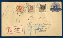 "LINKÖPING 23.6.1907". 10 öre Frankokuvert + 10 öre Provisorier samt 2+3 öre Ringtyp ph (F.40,41,51).