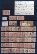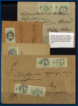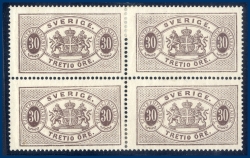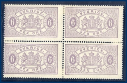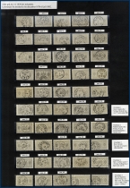 med positionsbestämda märken 1-50 (Helark) på varje plansch för varje valör. Drygt 2.500 st märken på 51 st planscher. 3 öre (200 st), 4 öre (150 st), 5 öre (250 st), 6 öre (200 st), 12 öre (800 st), 20 öre (150 st), 24 öre (350 st), 30 öre (200 st), 50 öre (100 st), 1 krona (150 st). Genomgående bra kvalitet med utvalda vackra stämplar. Katalogmärkesvärde drygt 850.000 kr med högt plusvärde av vackra stämplar. Dessutom 119 st försändelser frankerade med valörer från 3 öre till 24 öre i olika portokombinationer inklusive 14 st Fribrev.