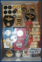 med bla 3 svenska minnesmynt i silver (totalt 300 kr), 1 US silverdollar 2020. 1 Bitcoin, många olika svenska lokalmynt, påse med drygt 20 st myntrullar med småvalörer (ej kollade av oss), 3 st äldre Engelska "tokens" i mässong: Georgivs III 1790, Exhibition building 1862, Cumberland Jack 1859. Även lite övrigt samt Järnvägsknappar och uniformsmärken. En trevligt blandad låda.