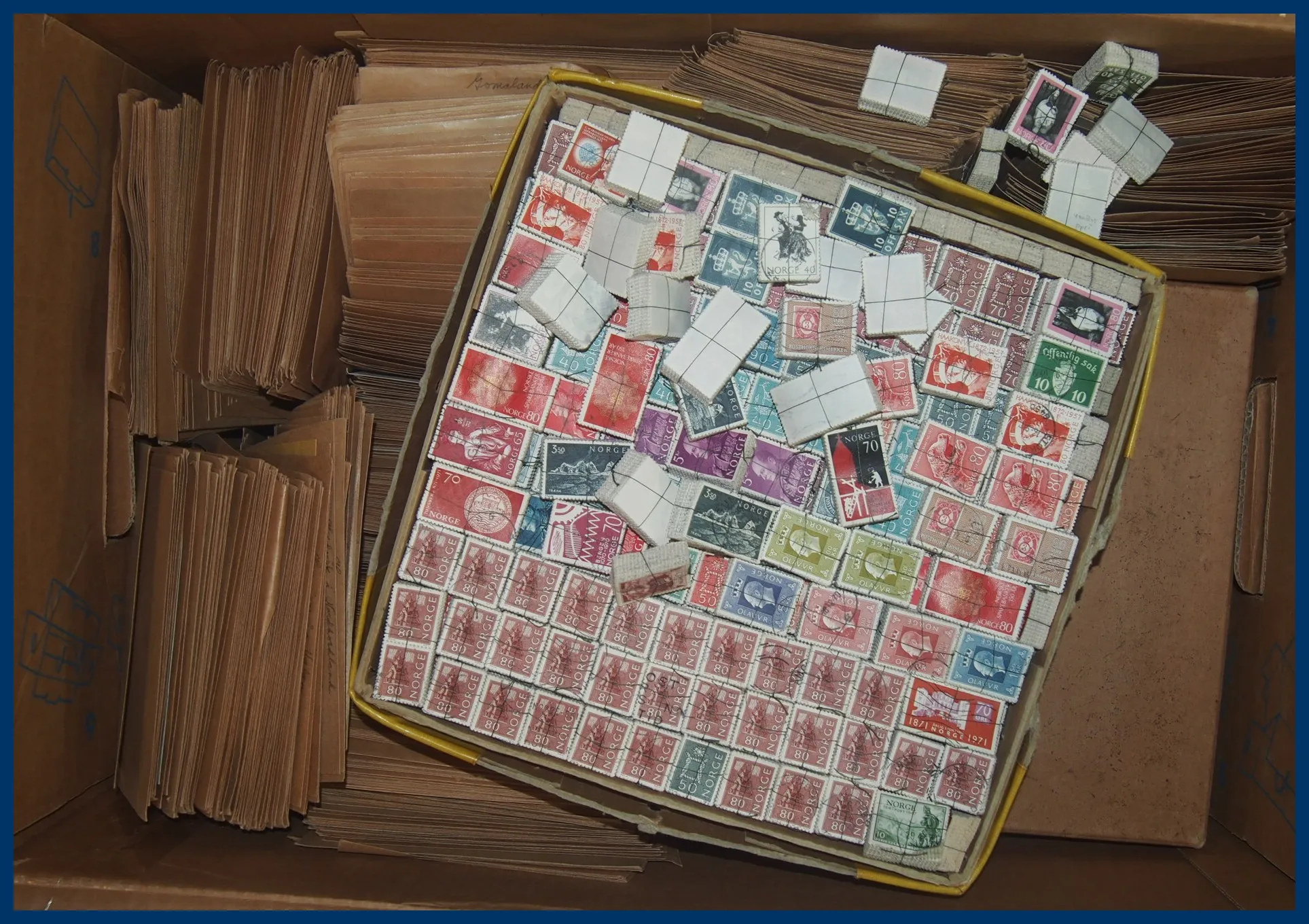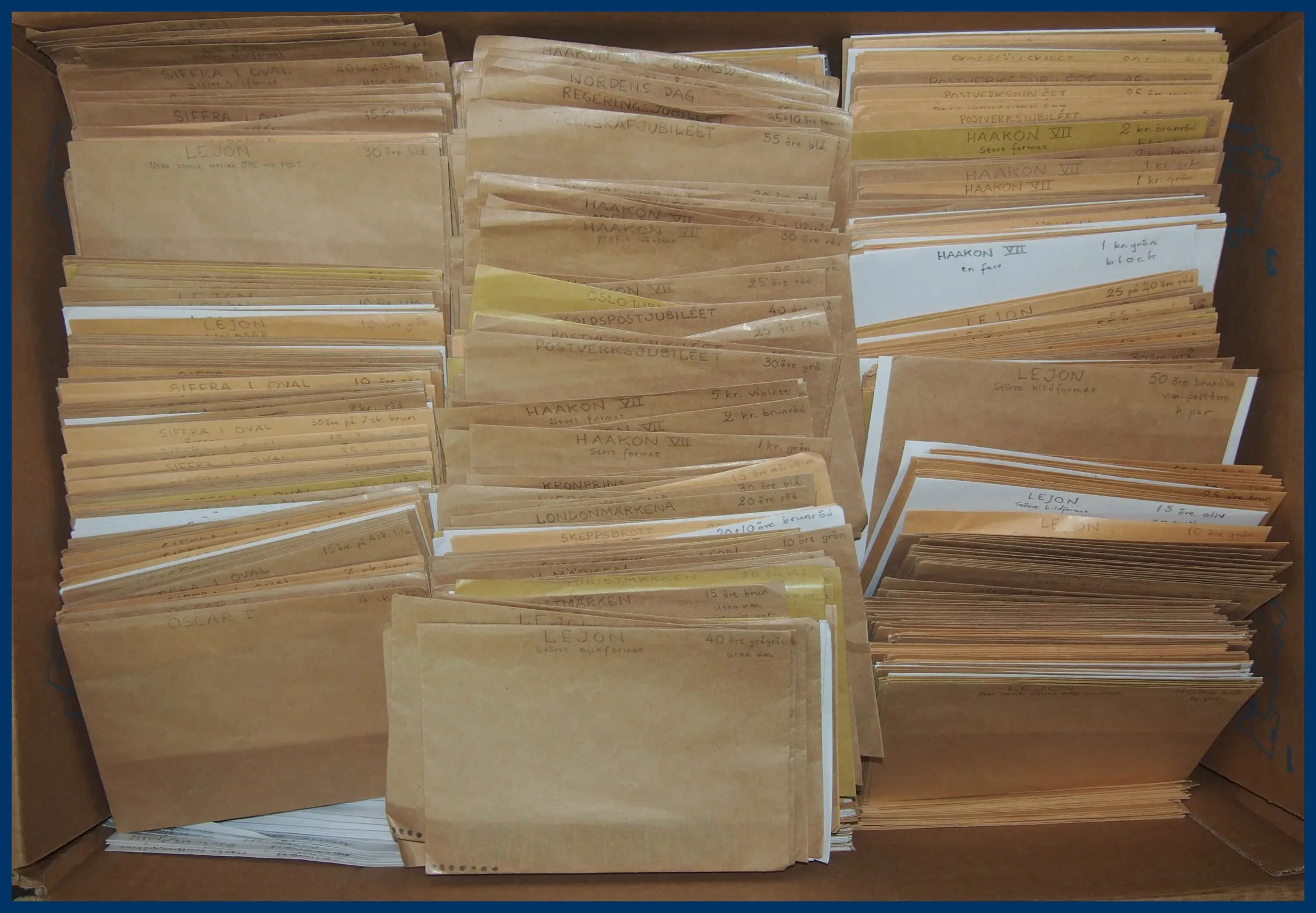 2 stora flyttlådor, sorterat efter katalognummer i A6-kuvert samt 1000-tals 100 buntar i 4 större askar. Massor att gå igenom.