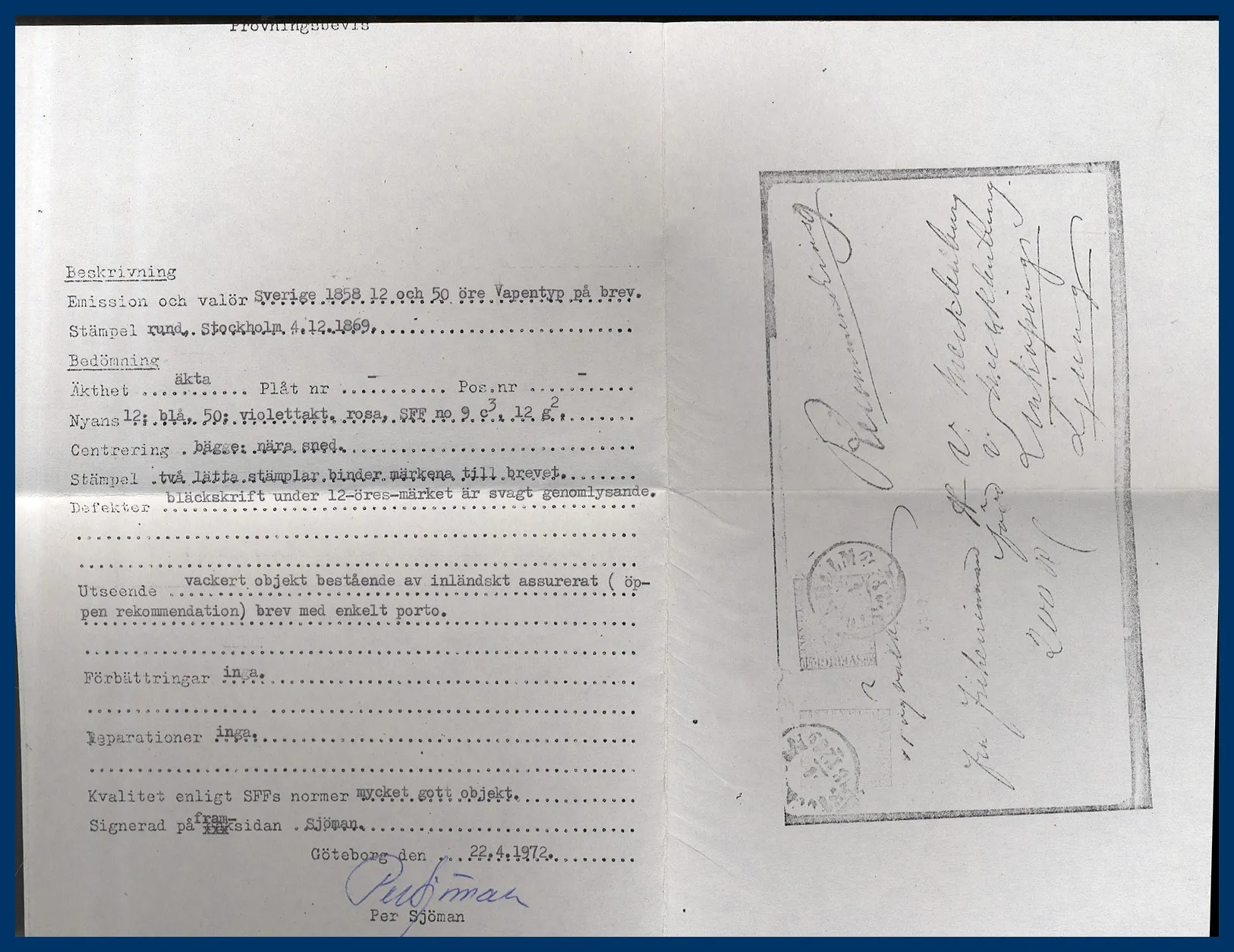 "STOCKHOLM 4.12.1869" sänt till Linköping/Ljung. Intyg Sjöman (1972) Mycket gott objekt. Facit 4.500 kr.