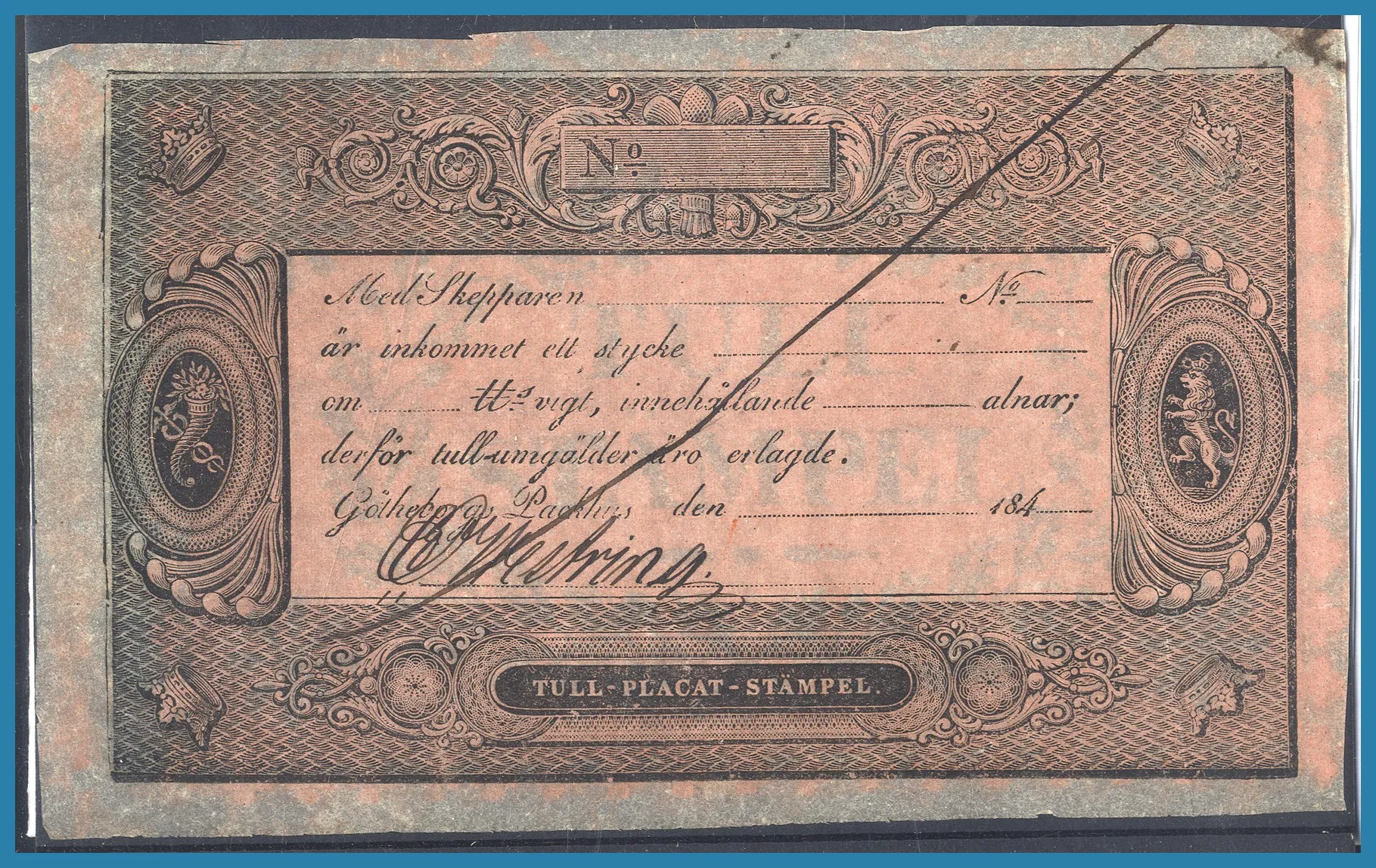 14. (A) 1842 Tullstämpelmärke för importerat tyg, Göteborgs Packhus.