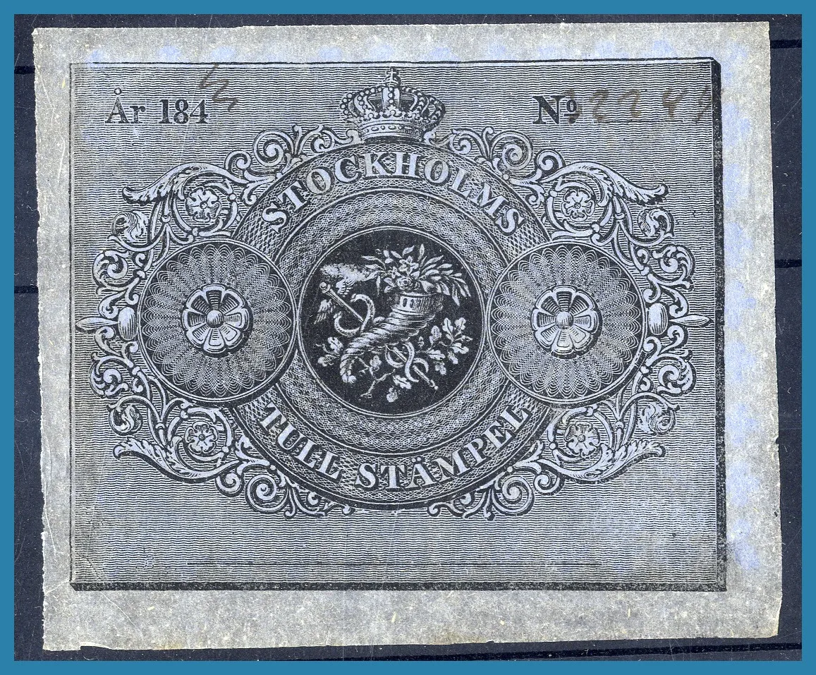 13. (A) 1842 Tullstämpelmärke för mindre tyger, Stockholm.