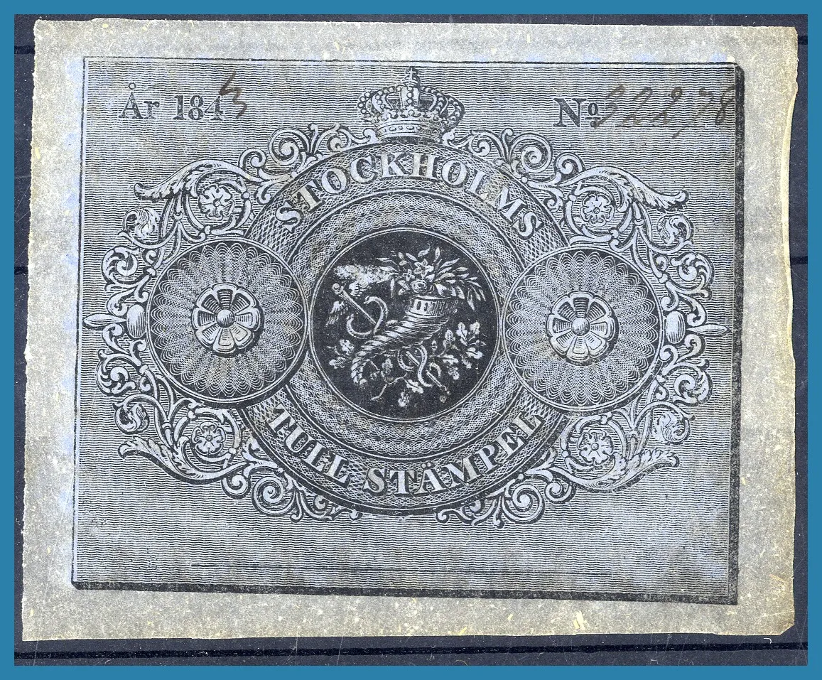 13. (A) 1842 Tullstämpelmärke för mindre tyger, Stockholm.