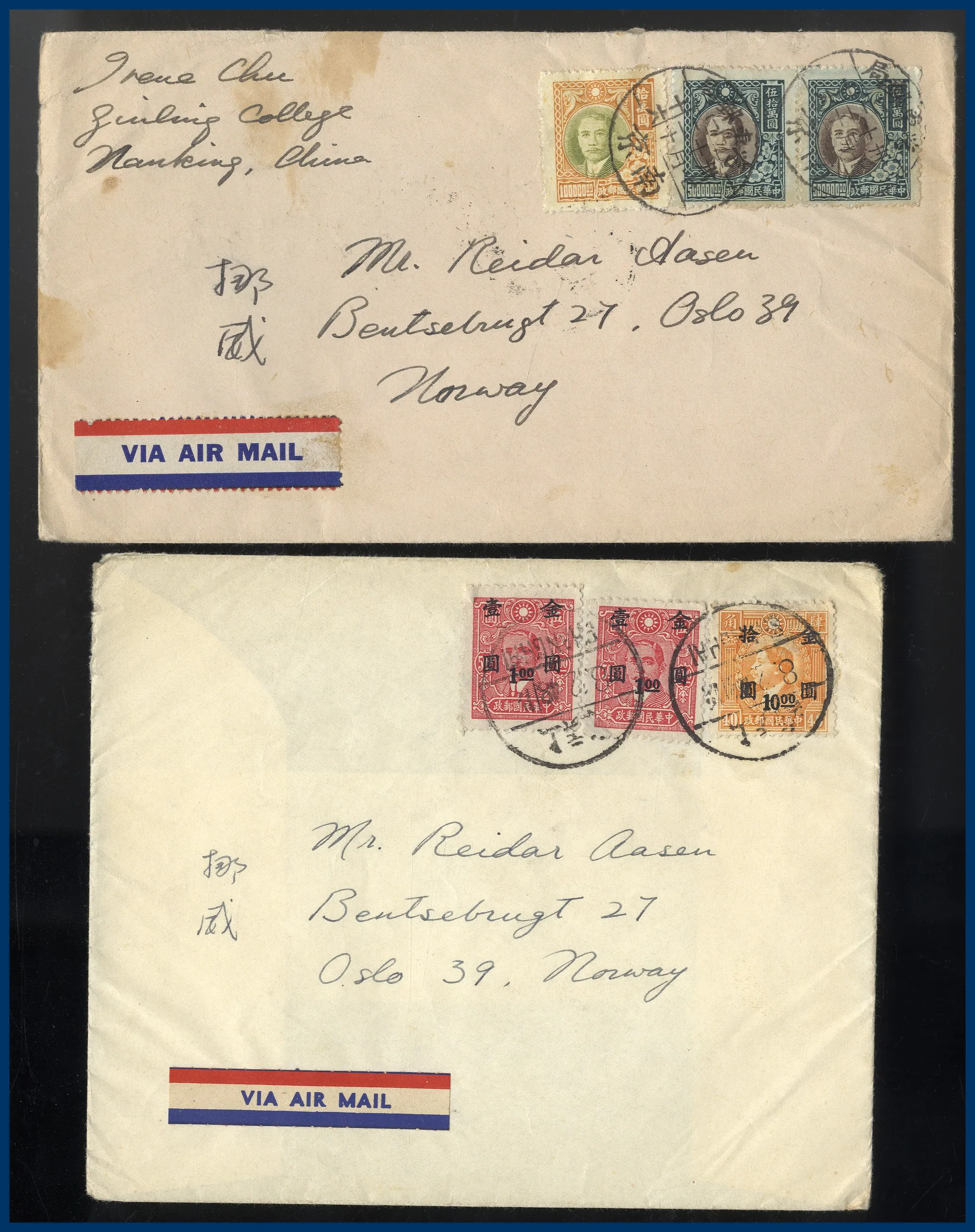 315. (A) 2 flygbrev från Kina 1948 till Norge med olika frankeringar.