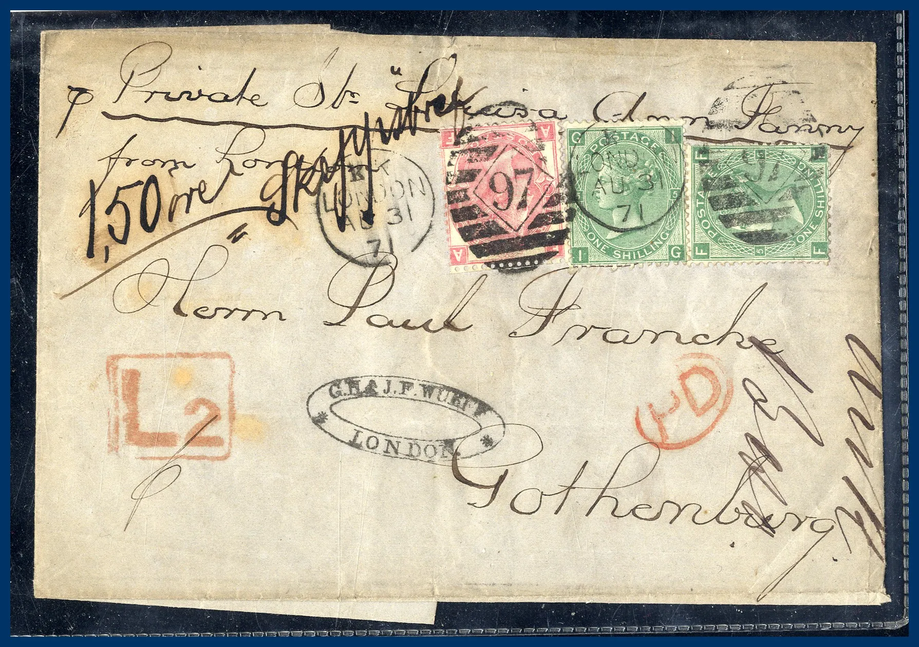 "1,50 öre"sänt från London AU 31 1871 till Göteborg med röd stämpel "PD" och "L2".
