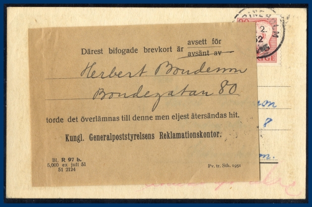 sänt till Stockholm där mottagaren inte kunde hittas. Posten har klistrat på en omdirigeringsetikett (Bl. R 97 b.) till Kungl. Generalpoststyrelsens Reklamationskontor. Bakom denna en lila ovalstämpel med ankomst noterad 28 FEB 1952. Ovanlig etikett, speciellt på brevkort.