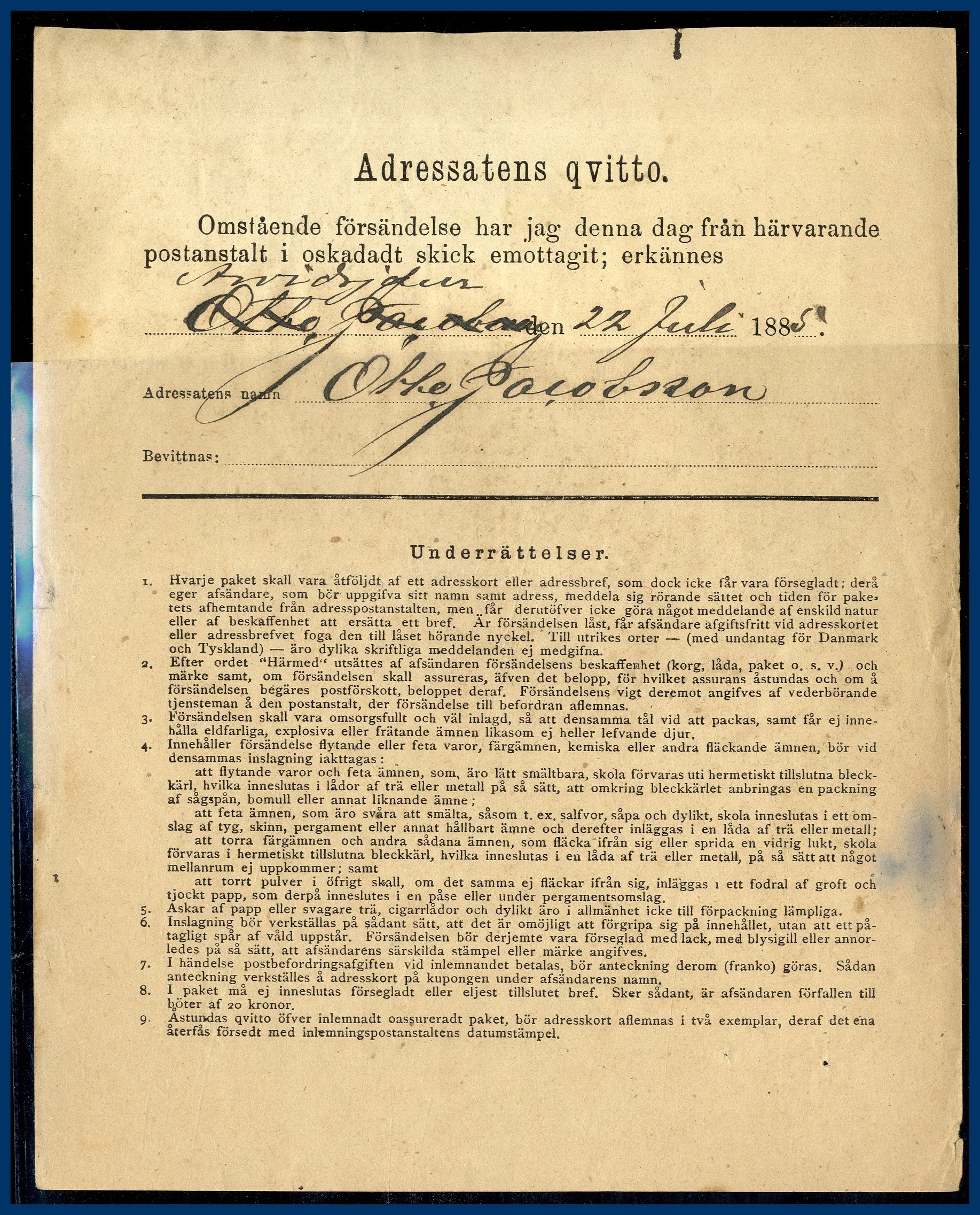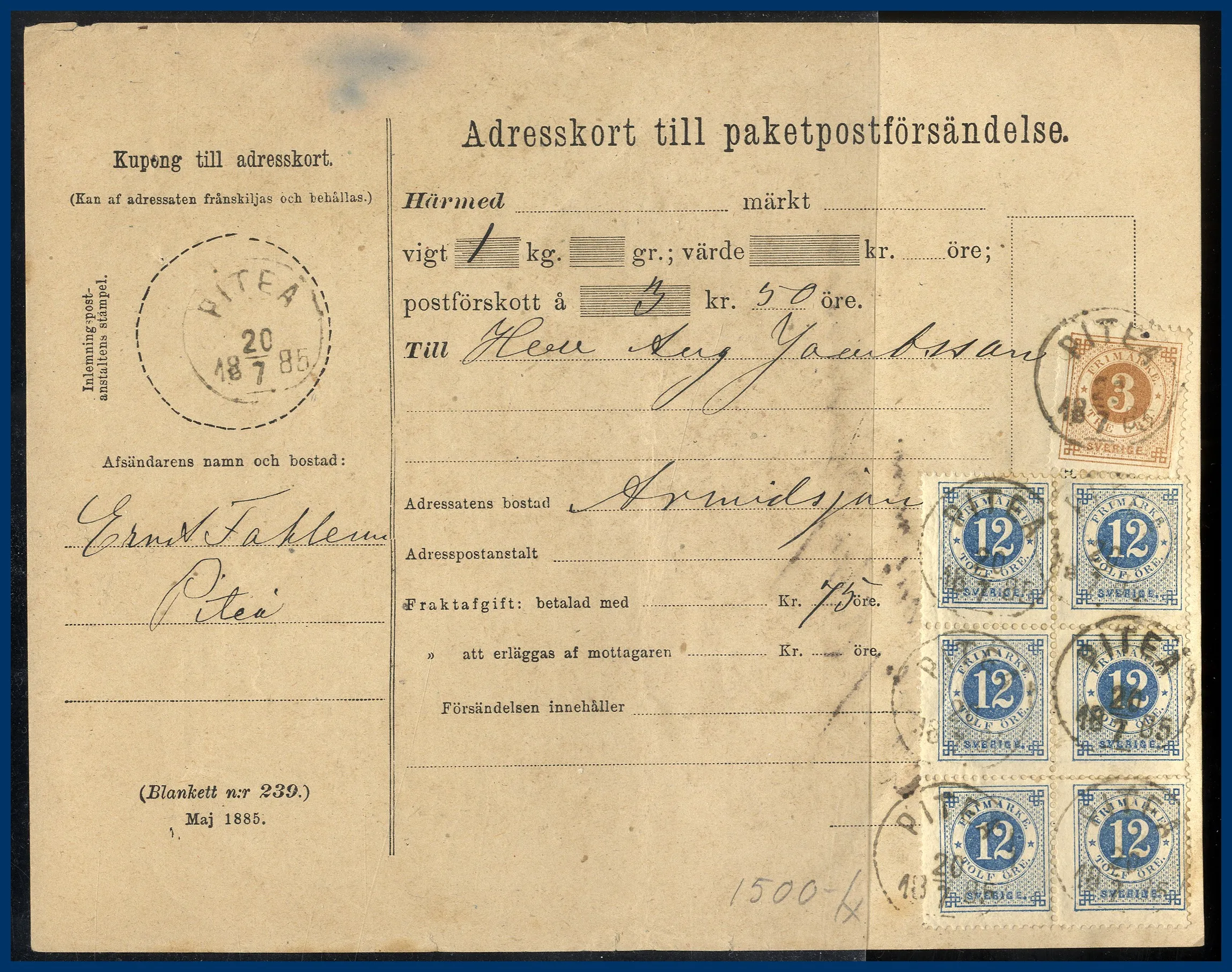 Paketadresskort (1 kg) med postförskott (3,50 kr) avstämplat "PITEÅ 20.7.1885" och sänt till Arvidsjaur. 1 kg 50 öre, Pf 25 öre = 75 öre, Korrekt porto. Enda kända med denna portokombination.