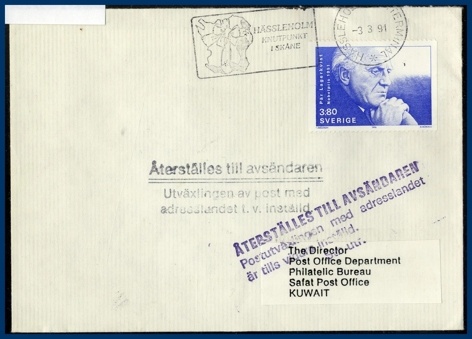 med två olika stämplar "....Utväxlingen av post med adresslandet t.v. inställd" och "...Postutväxlingen med adresslandet....". Avstämplad "HÄSSLEHOLMS POSTTERMINAL 3.3.91".